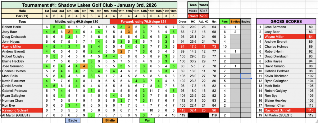 Looks like the weather cooperated and let our golfers play in a January Tournament!  Hope that bodes well for the rest of the year.  19 golfers went to Shadow Lakes in Brentwood and enjoyed hitting small white dimpled balls around a large field.