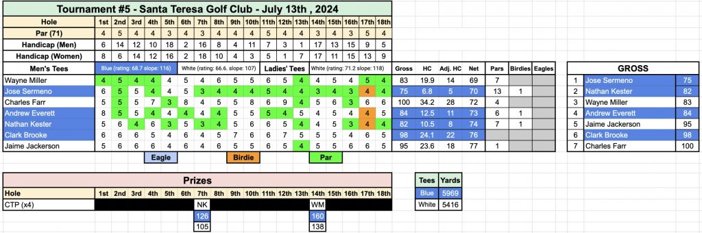 We had 7 players for July 13th Santa Teresa Tournament.  There were 3 birdies on the 17th hole!