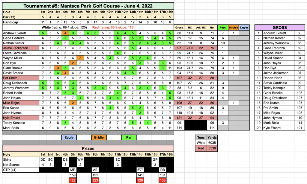 20 of us played at Manteca Park Golf Course on June 4th and we all had a great time playing there.  The course proved to be tougher on the front 9 than the back 9 even though all the birdies were on the front 9, however, it was a fun place to play a game we like to call “golf” there!