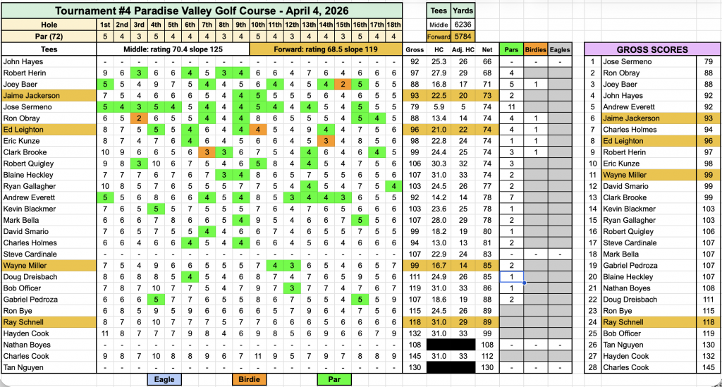 What a great outing at Paradise Valley for NCGAD today!  We had a big group playing today: 28 players!  Perfect weather at PV as well, sunny, slight winds, and great temperatures.  Tough course though for the majority of us because the greens were not easy to read.  It was an enjoyable round of golf for all and a preview for the upcoming 2026 FWGAD.  Also, a whopping 7 players tied for 5th, all netting 74 after HC adjusted!
